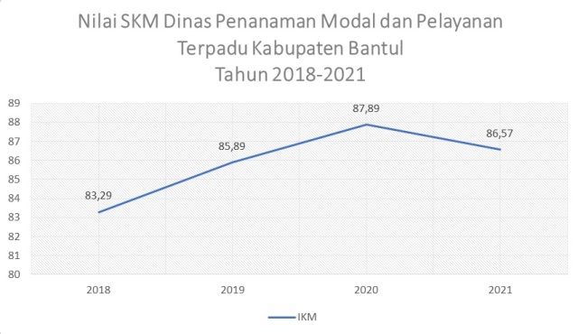 Pelaksanaan pelayanan publik di Dinas Penanaman Modal dan Pelayanan Terpadu Kabupaten Bantul, secara umum mencerminkan tingkat kualitas yang Baik dengan nilai SKM 86,57. Nilai SKM Dinas Penanaman Modal dan Pelayanan Terpadu Kabupaten Bantul menunjukkan konsistensi peningkatan kinerja penyelenggaraan pelayanan publik dari tahun 2018 hingga 2020, meskipun pada tahun 2021 ini mengalami penurunan.